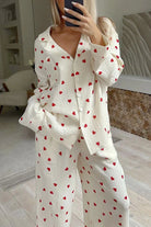 تتميز بيجامة النساء ذات الأزرار بنقشتها من القلوب الحمراء وقميصها المزود بأزرار مع ياقة مسننة. يضمن بنطالها السلس حرية كبيرة في الحركة. مثالية للاسترخاء في المنزل برفق وأسلوب.