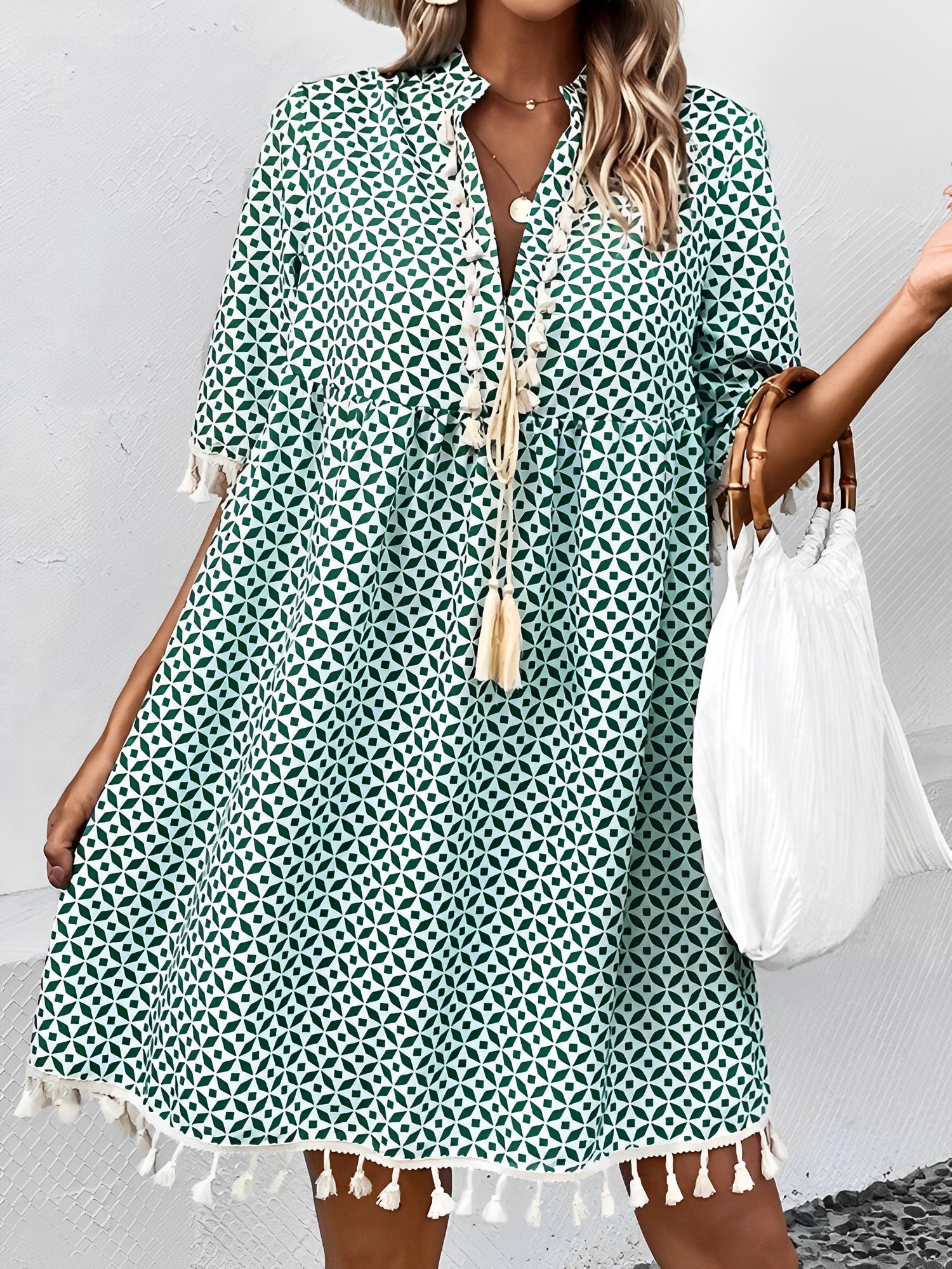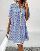 هذا الفستان الصيفي يتميز بنقشة عصرية وقصة مريحة. أكمامه القصيرة وخفته تجعله اختيارًا مثاليًا للأيام المشمسة. مثالي للمدينة أو العطلات أو الخروج مع الأصدقاء.