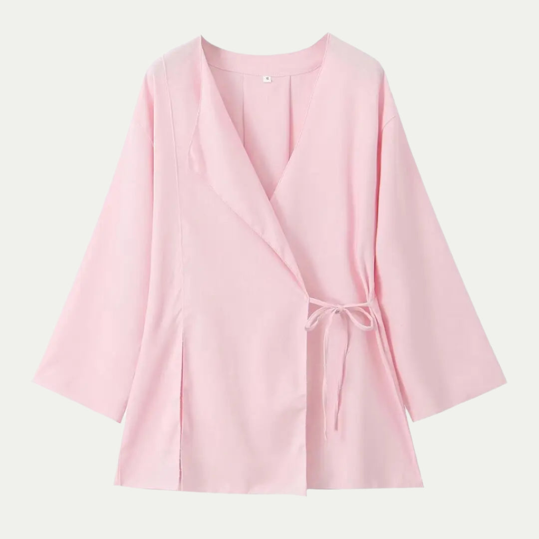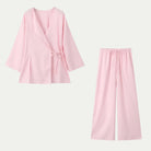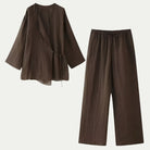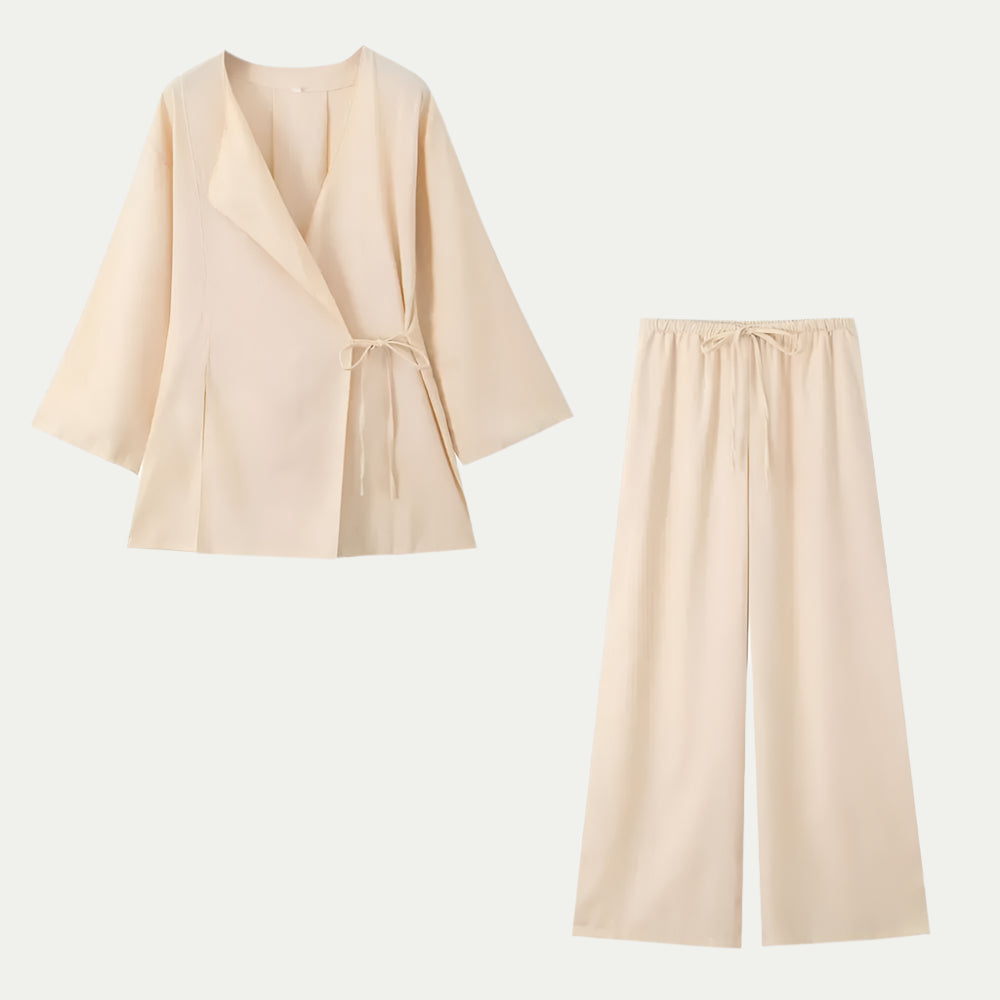 تجمع هذه المجموعة بين قميص بأسلوب الكيمونو بأكمام واسعة وسروال عالي الخصر بأرجل واسعة لإطلالة سلسة وم refined. خفيف ومريح، إنه مثالي للأيام الحارة. متوفر بعدة ألوان، يجمع بين الأسلوب الصيفي وحرية الحركة.