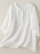 هذه القميص المزود بأزرار يكشف عن قوام سلس وأنثوي. يضفي طوقه المزخرف بالدانتيل لمسة رقيقة ورومانسية. قصته المريحة تجعله خيارًا مثاليًا لأناقة يومية.