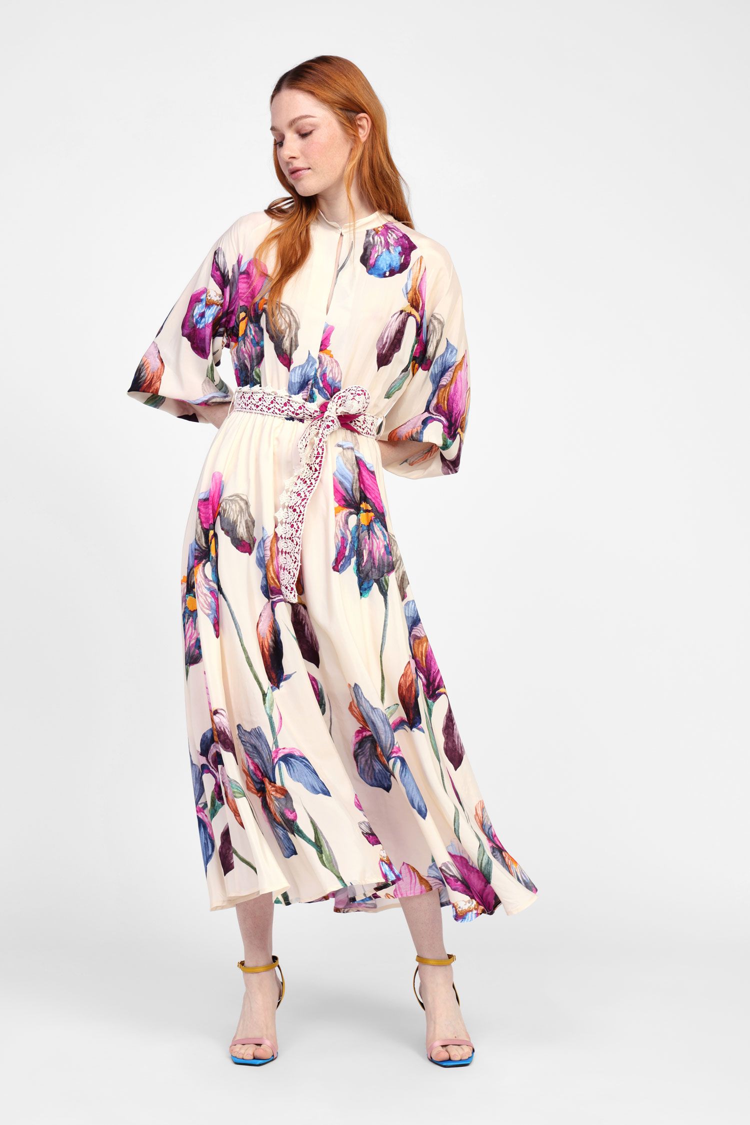 Tento dlouhý šat nabízí plynulou siluetu zvýrazněnou jemným háčkovaným páskem. Jeho květinový potisk přináší nádech svěžesti a ženskosti. Ideální pro akce, dovolenou nebo večer s přáteli.