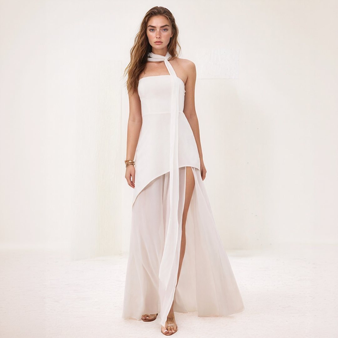 Oriane | Elegant Lang Splittet Kjole med Fine Stropper
