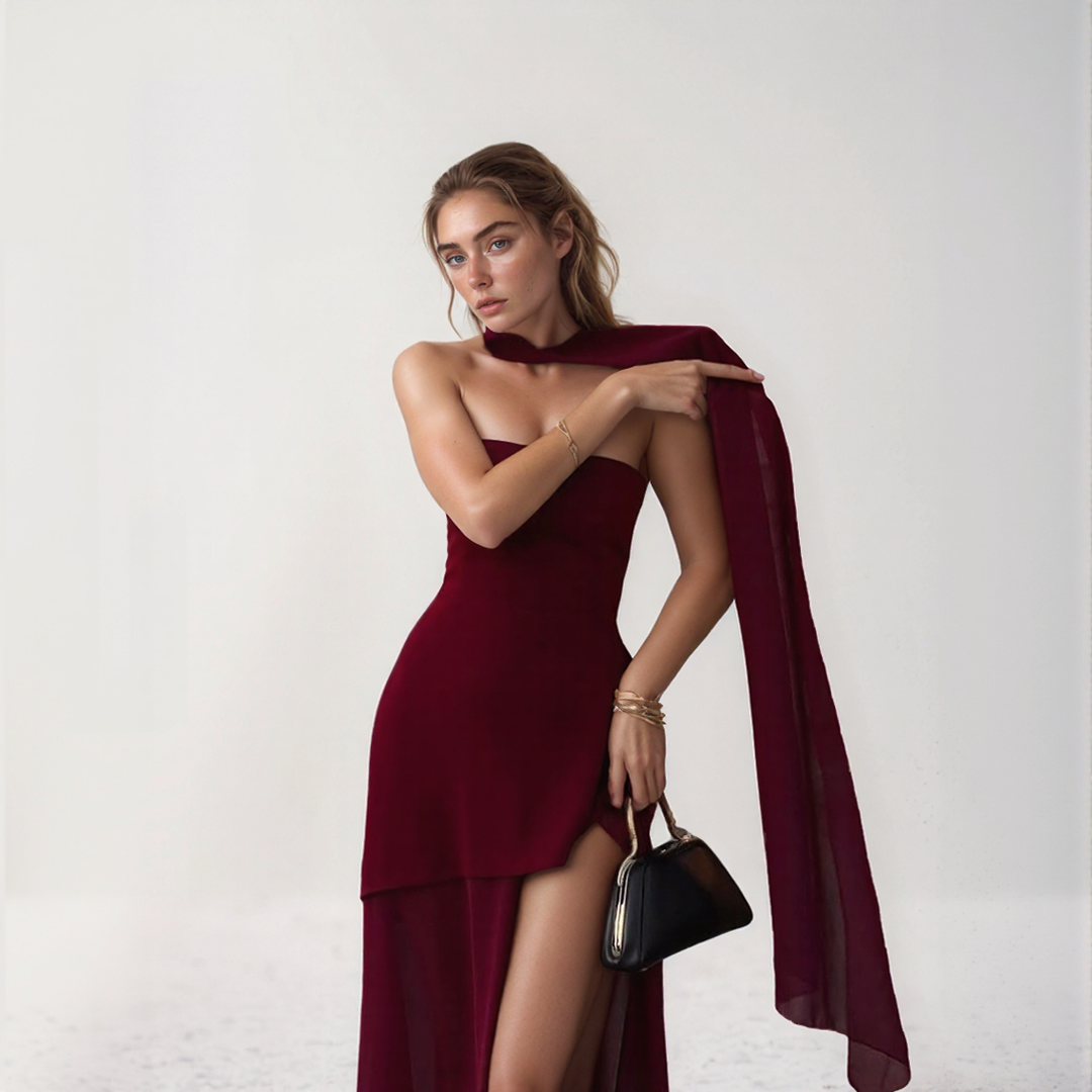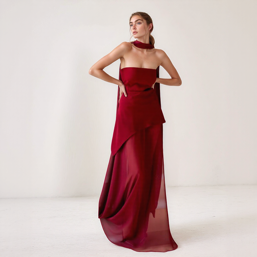 Nelly | Lang Elegant Kjole – Asymmetrisk Snit Og Integreret Halstørklæde