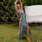 Αυτό το μακρύ φόρεμα με σκισίματα γοητεύει με την ρευστή του γραμμή και την ασύμμετρη πτώση του. Ο κολαρός του σε σχήμα V και τα κοντά μανίκια σε στυλ πεταλούδας προσθέτουν μια πινελιά θηλυκότητας bohemian. Ιδανικό για να αφήσετε το στυλ σας να μιλήσει με ελαφρότητα και κομψότητα.