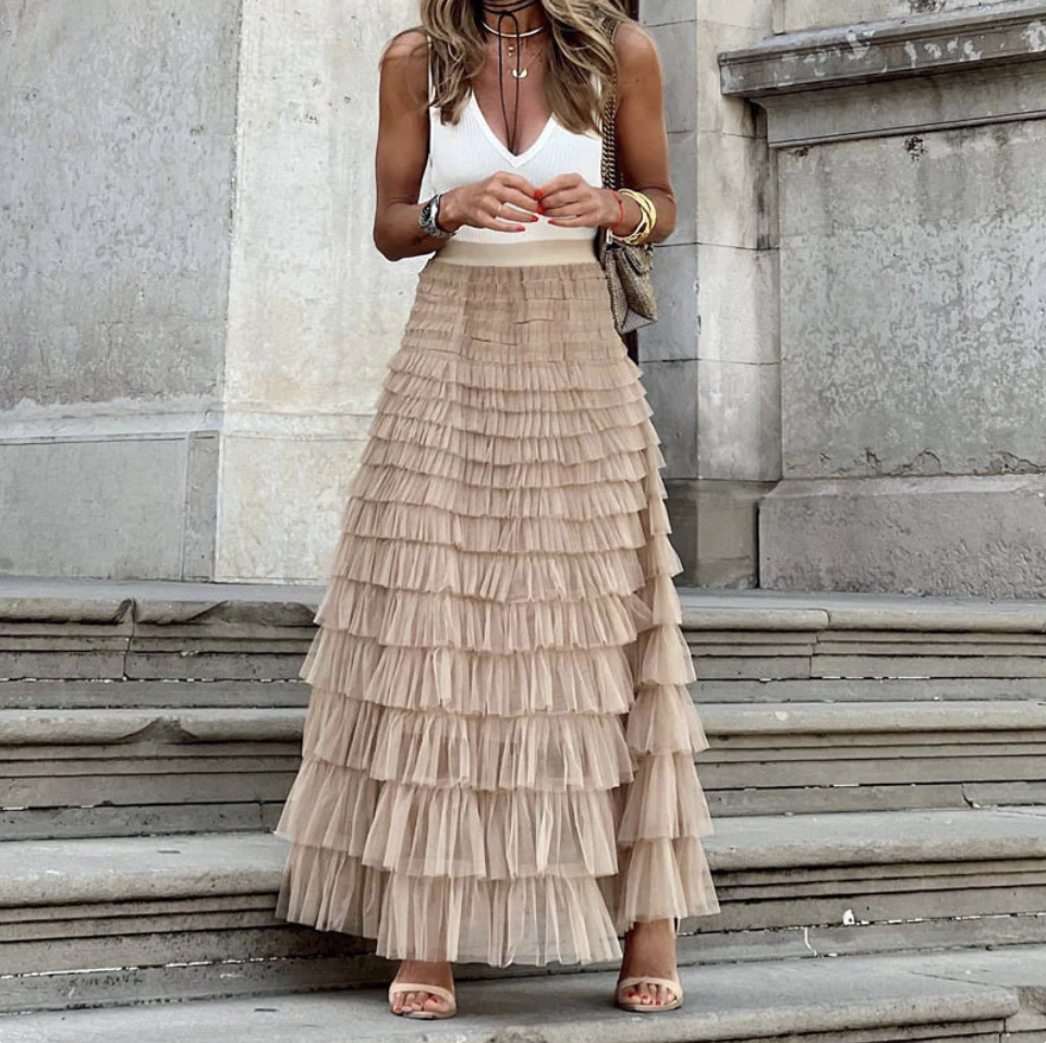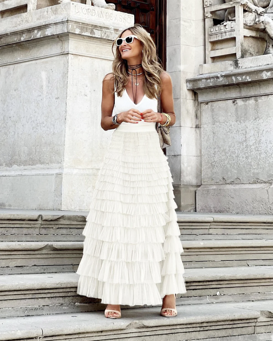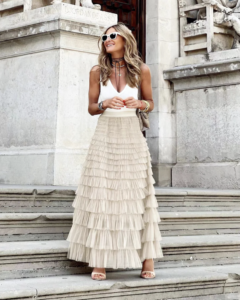 Αυτή η ρομαντική φούστα με βολάν αναδεικνύει τη σιλουέτα χάρη στην αέρινη πτώση της και την κολακευτική γραμμή της. Το μποέμ σικ στυλ της την καθιστά ιδανική επιλογή για ηλιόλουστες μέρες ή ειδικές περιστάσεις. Ελαφριά και ευχάριστη στη χρήση, συνοδεύει κάθε σας βήμα με κομψότητα.
