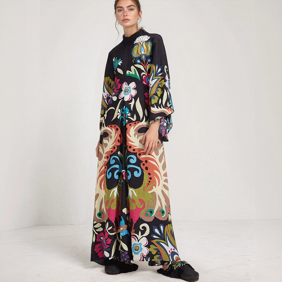 Αυτή η μακριά φόρεμα διαθέτει τολμηρά λουλουδάτα σχέδια και ρέουσα γραμμή. Ο ψηλός γιακάς της με λεπτομέρεια κόμπου στο πίσω μέρος προσθέτει μια κομψή πινελιά. Ιδανική για όλες τις εποχές, προσφέρει μια διαχρονική μποέμικη κομψότητα.