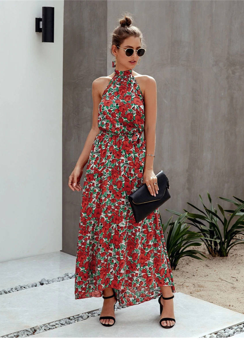 Αυτή η μακριά φόρεμα με μποχέμ στυλ διαθέτει λουλουδάτα μοτίβα και ρευστή γραμμή. Ο ψηλός γιακάς με κλείσιμο πίσω αποκαλύπτει απαλά τους ώμους.