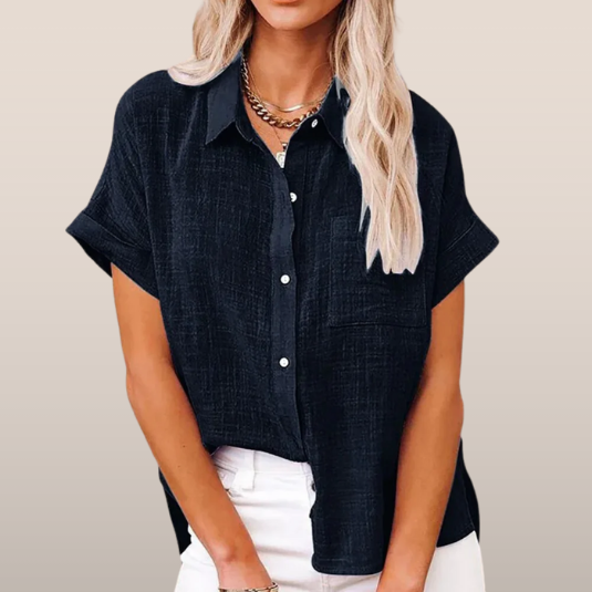 חולצה זו מציעה קאט רחב אידיאלי לימים חמים. הצווארון הקלאסי שלה וסגירת הכפתורים מוסיפים נגיעה אלגנטית. מושלמת למראה נינוח או מקצועי.
