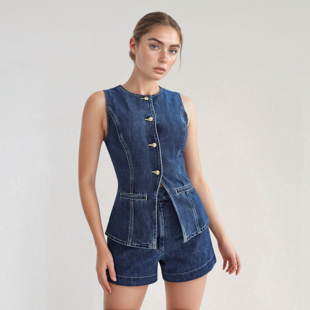 סט זה כולל ג'קט ללא שרוולים עם כפתורים מוזהבים וכיסים קדמיים. השורט במותן גבוהה מציע חיתוך מחמיא ונוחות אופטימלית.