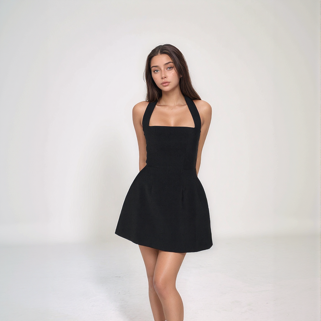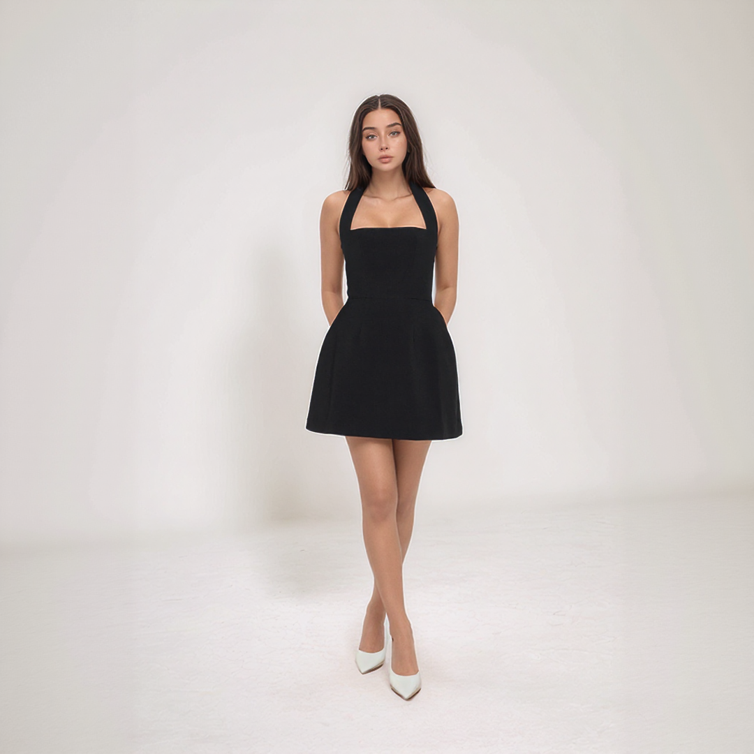 סנדרה | שמלת מיני קיץ – מחשוף הולטר ונפח זורם