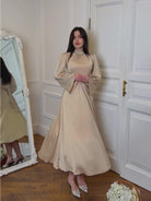 שמלות ארוכות אלו מגלמות את העידון עם צווארון גבוה, שרוולים ארוכים ודמות זורמת. החגורה המובנית מדגישה את המותן בעדינות, מוסיפה מבנה ונשיות. אידיאלית לאירועים מיוחדים, היא משלבת נוחות, סגנון ואלגנטיות בפשטות.