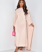 Questo abito lungo incarna la grazia e la femminilità con una silhouette fluida e dettagli curati. Il suo scollo rotondo classico e le maniche drappeggiate aggiungono un tocco di raffinatezza e dolcezza. Perfetto per cerimonie, cene formali o serate eleganti.