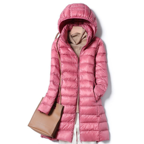 Questo piumino lungo offre un calore avvolgente rimanendo leggero ed elegante.