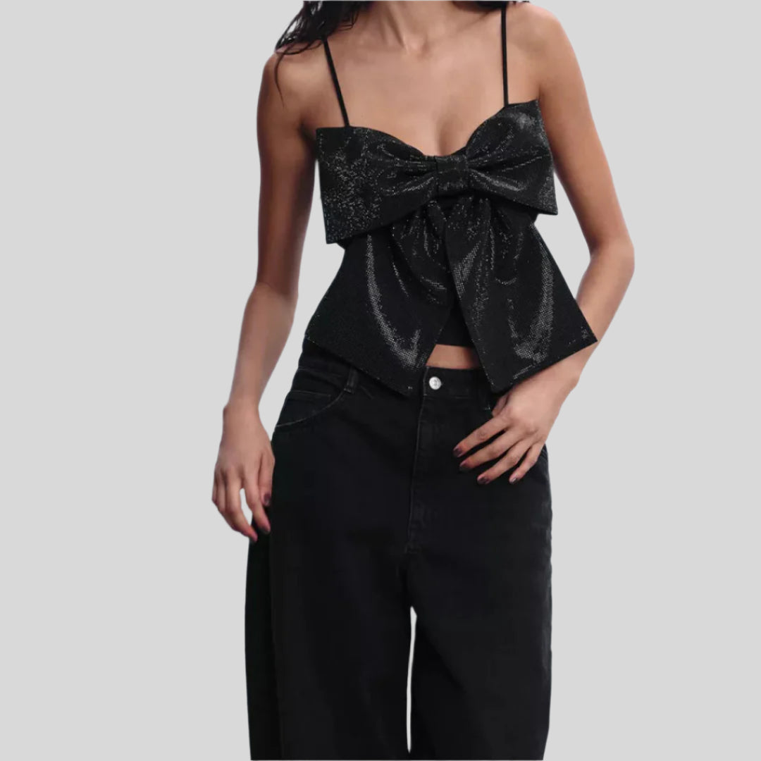 Questo elegante top presenta un design scintillante arricchito da un nodo distintivo. Perfetto per occasioni speciali o per aggiungere un tocco sofisticato al tuo outfit quotidiano. Disponibile in diverse taglie per adattarsi a tutte le silhouette.