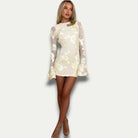 このミディドレスは、繊細な花の刺繍とわずかに透けた長袖で魅了します。背中が開いたデザインは控えめなセクシーさを加え、特別な場面にぴったりです。複数の色でご用意しており、エレガンスを持ってあなたのすべての欲望に応えます。