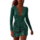このきらめくドレスは、フィット感のある洗練されたカットでシルエットを引き立てます。光るスパンコールのディテールは微妙な輝きを与え、夜のイベントやエレガントな場面で注目を集めるのに最適です。