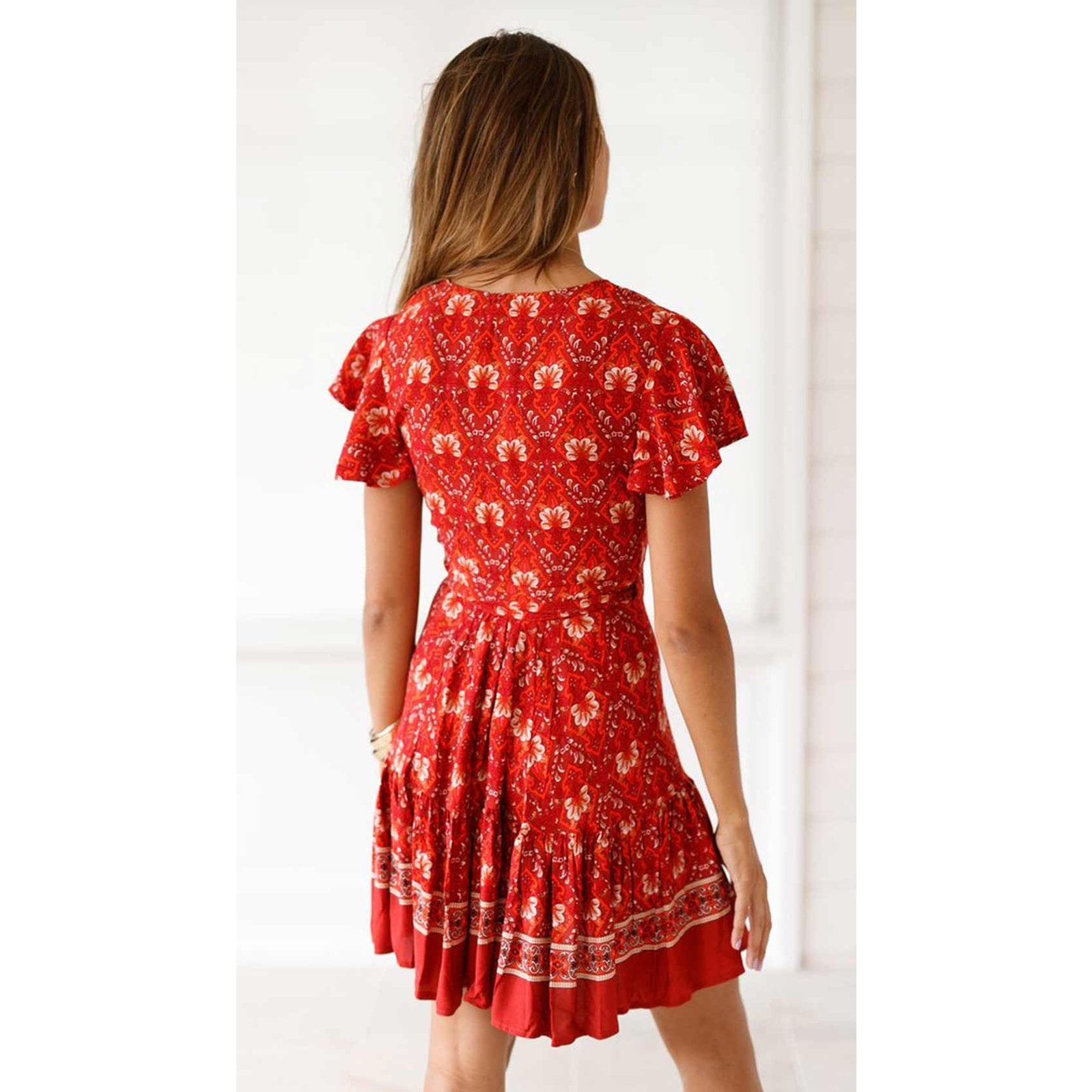 この赤いハートカットドレスは、Vネックと調整可能なウエストでシルエットを引き立てます。花柄のプリントがボヘミアンなタッチを加え、バタフライスリーブが軽やかさと女性らしさをプラスします。晴れた日や夏の特別な場面にぴったりです。
