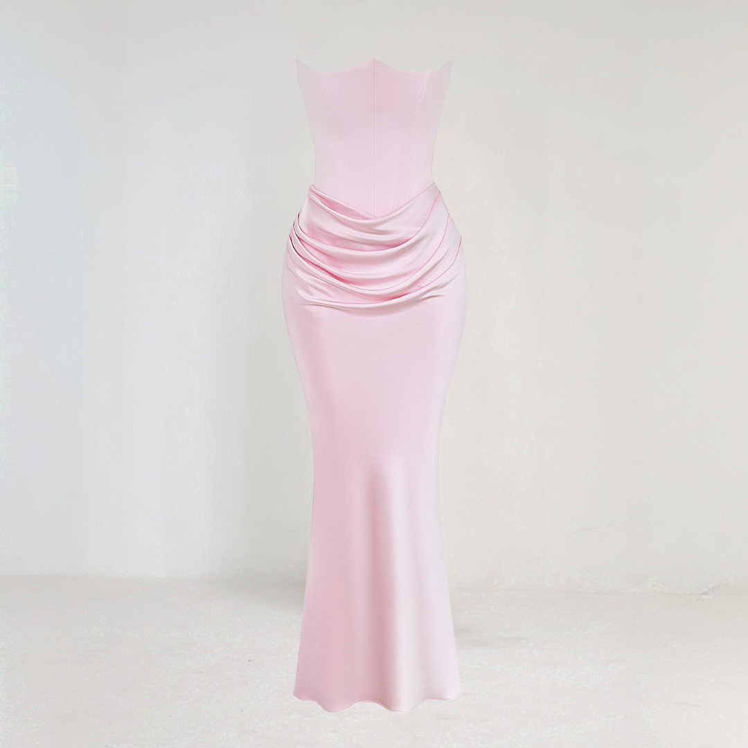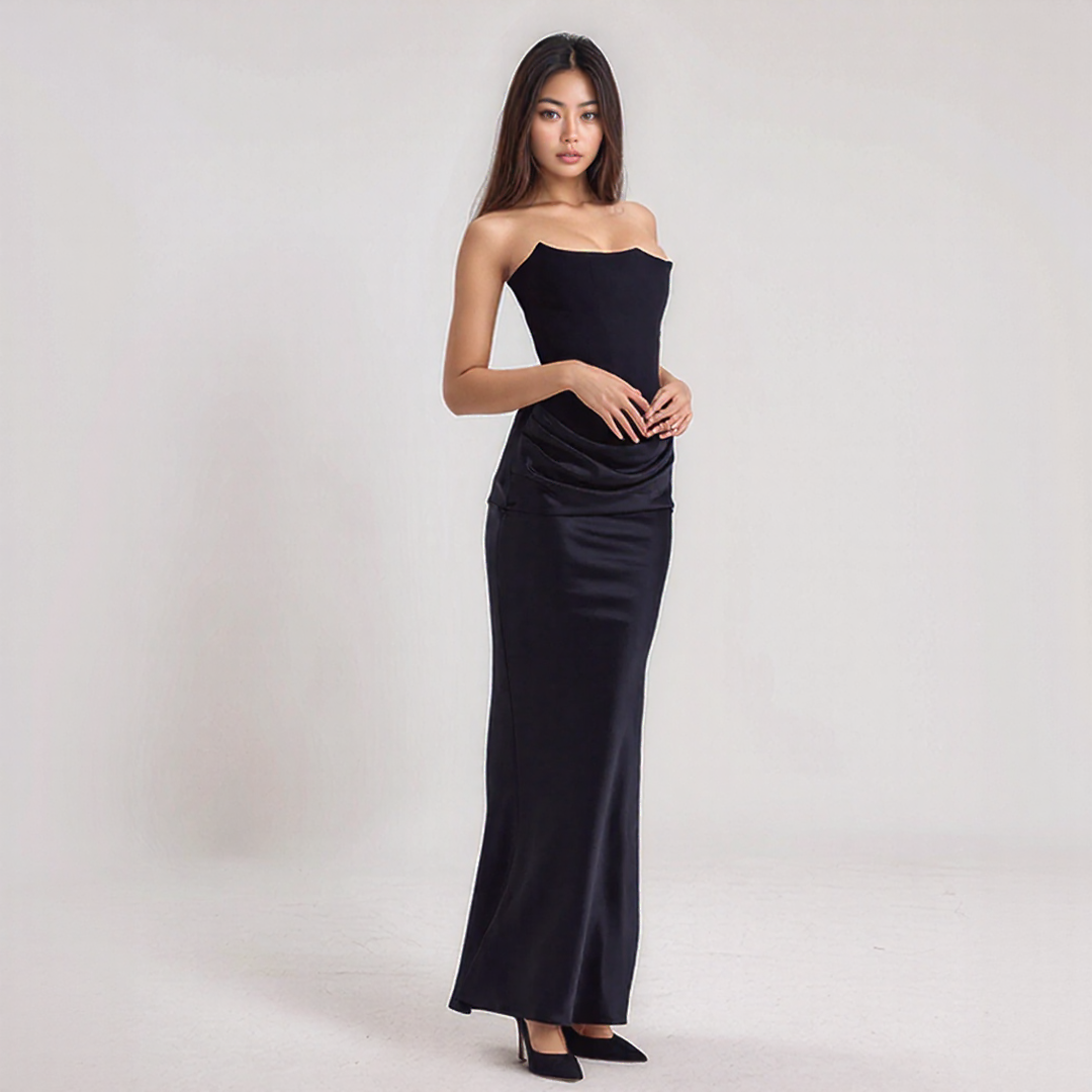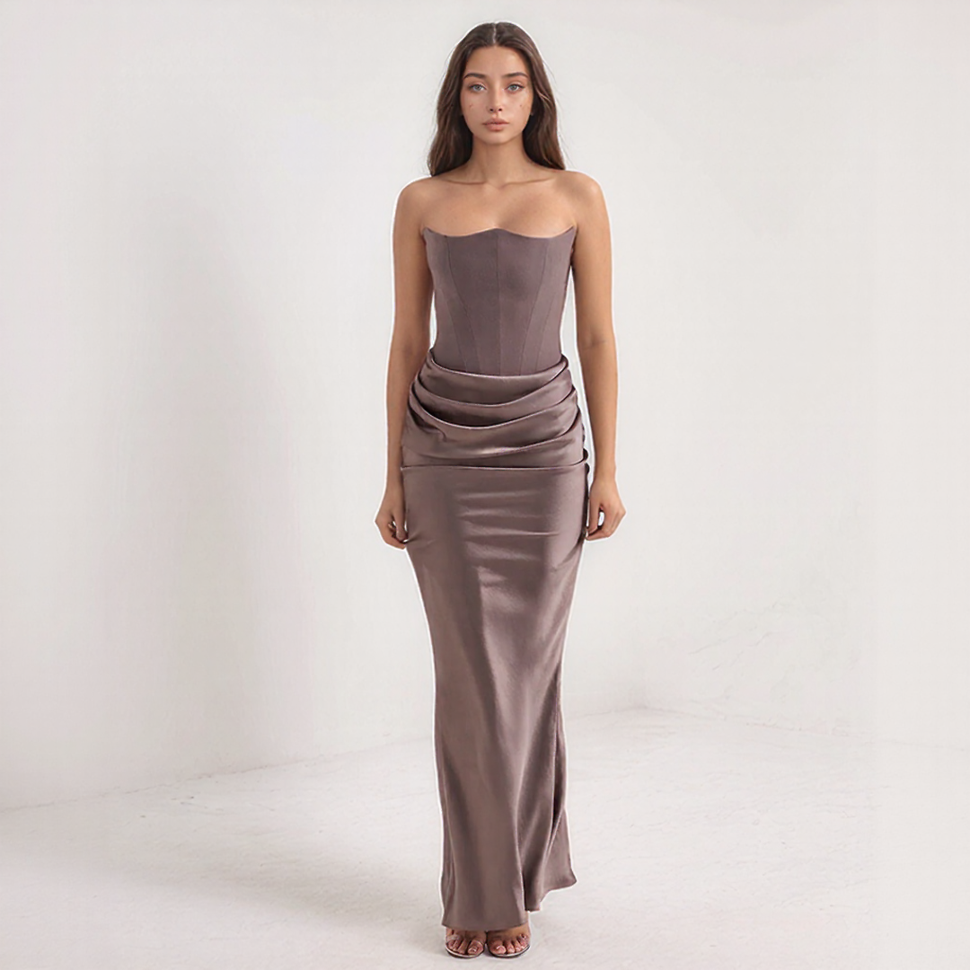 このエレガントなコルセットドレスは、その構造的なトップによってシルエットを引き立てます。ストラップなしのデザインと流れるようなカットが、自然な洗練をもたらします。フォーマルなイベントや特別な occasion に最適です。