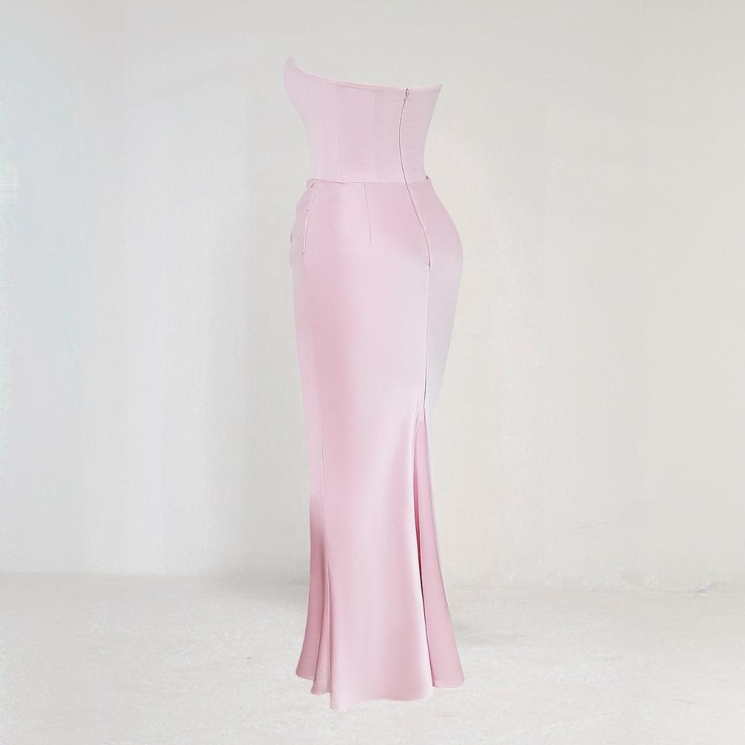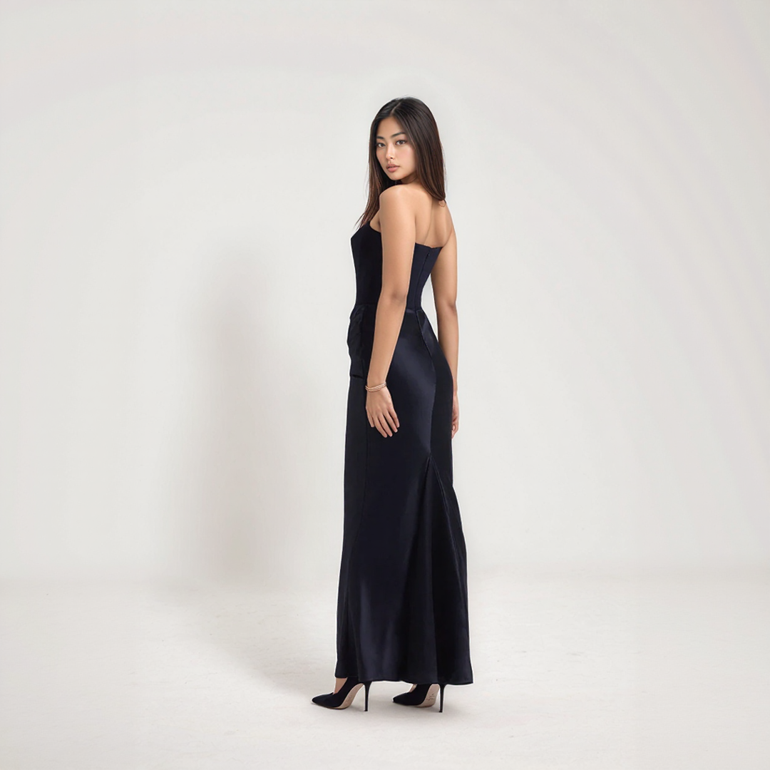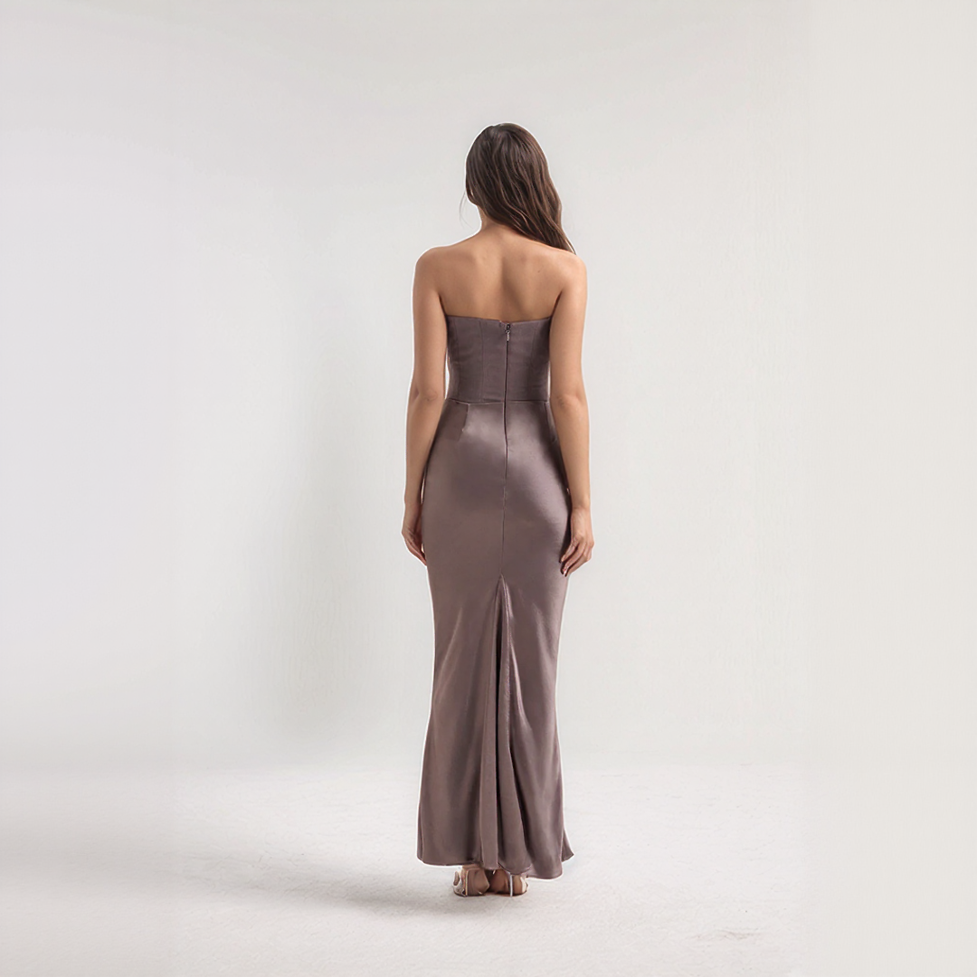 このエレガントなコルセットドレスは、その構造的なトップによってシルエットを引き立てます。ストラップなしのデザインと流れるようなカットが、自然な洗練をもたらします。フォーマルなイベントや特別な occasion に最適です。